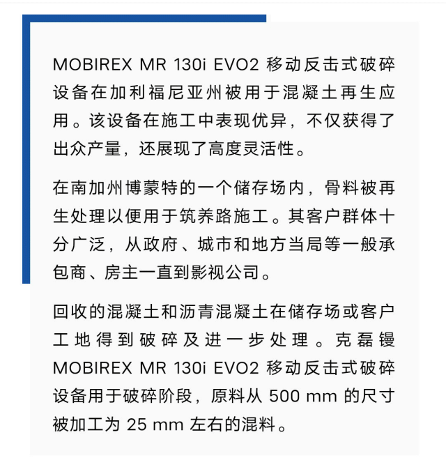 海外风采 | 克磊镘 MOBIREX 移动反击式破碎设备在加利福尼亚州再生混凝土