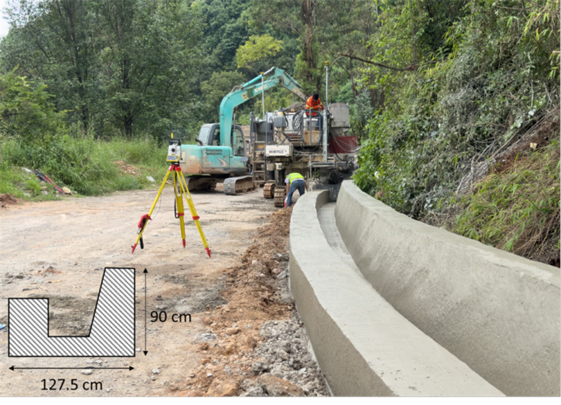 项目挑战:昆明老 108 国道的施工路段属于山区道路,项目要求的排水沟分为2种形状。除了常规的排水沟,还包括了总体宽度达 1270 mm, 一侧边缘高度达 900 mm 的异形道路排水沟。结构物尺寸大,而且随山区道路蜿蜒盘旋,普遍存在较大弯度和坡度。