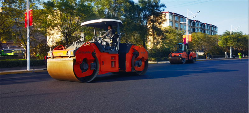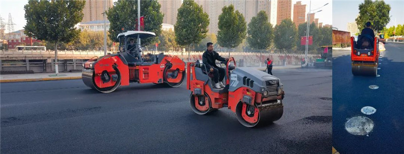 悍马小型压路机则配合大型压路机对道路边缘和过渡面、井盖边缘等区域做压实处理,确保压实区域无死角,整个面层平整度和压实度更好