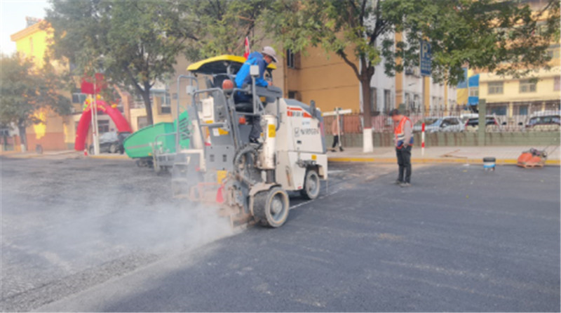 项目前期,施工方预先采用了 2 台维特根大型铣刨机,对旧道路面层进行铣刨移除。维特根2米档大型铣刨机,配备 WIDRIVE 智能铣刨系统,通过 LEVEL PRO PLUS 毫米级自动找平系统,实现铣刨面的高平整度,为后续的摊铺作业的平整度打好基础。同时还配合了 2 台小型铣刨机,就像微整形手术刀一样,对道路边缘、井盖周边的边角区域进行灵活移除,节约人工而且效率更高。