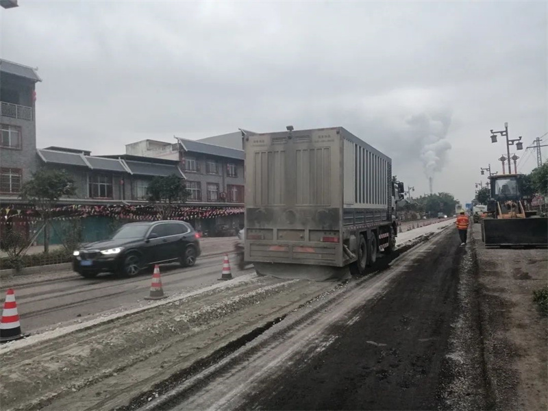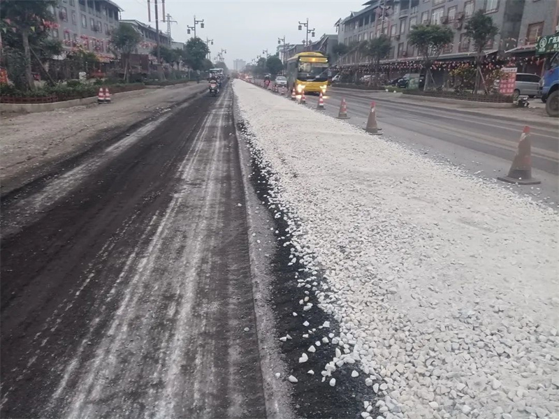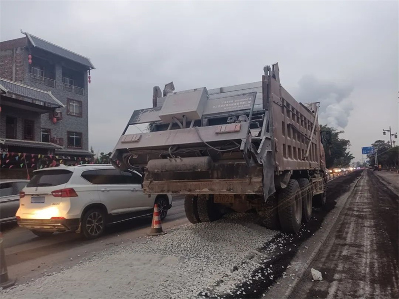 2.然后使用集料撒布机将新加的碎石和石屑(已按 1:1 比例预先混配好)均匀撒布于铣刨料之上;