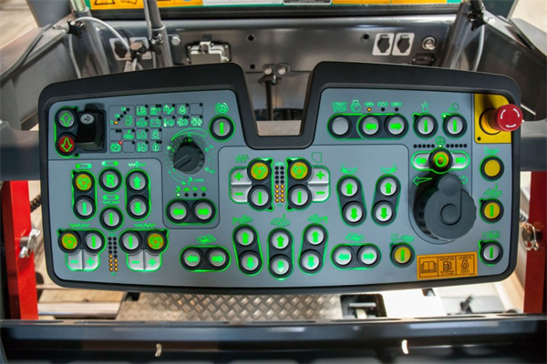 超级 700i/800i ErgoBasic 机手操控面板布局清晰、元器件均按逻辑排列,简单且实用。其中包括三大模块:机器运行和状态显示功能模块、材料输送功能模块、熨平板功能模块。机手在机器运行和状态显示功能模块可以进行摊铺机运转模式选择、预先设定转向角、发动机转速选择等一系列操作;材料输送模块可以进行搅龙速度调节、刮板输料器反转、材料输送自动化功能操作;熨平板功能模块可以进行预压实性能、熨平板加热系统等操作。